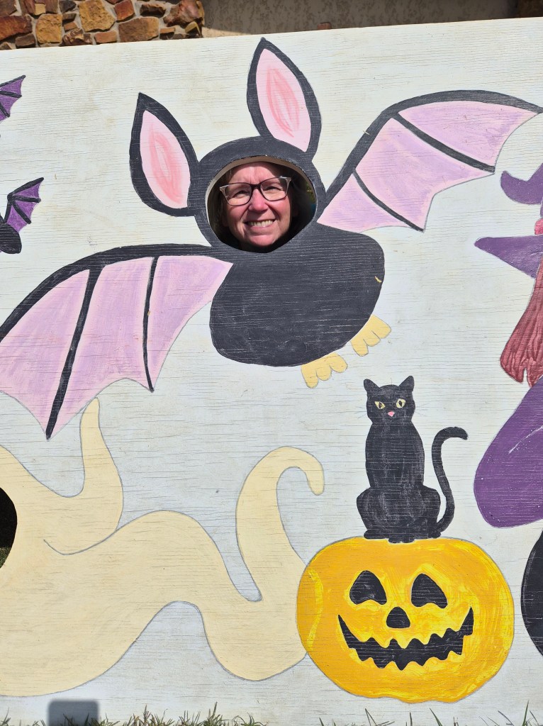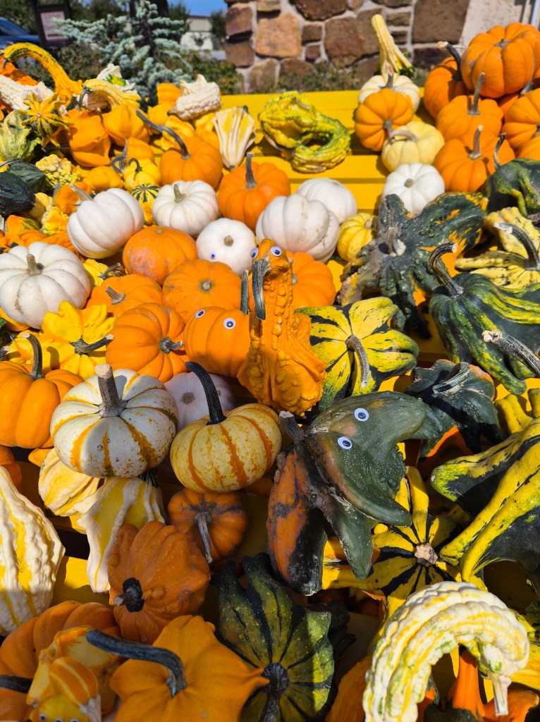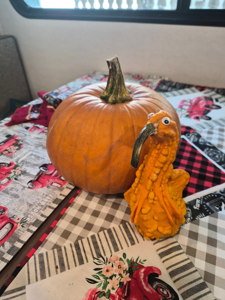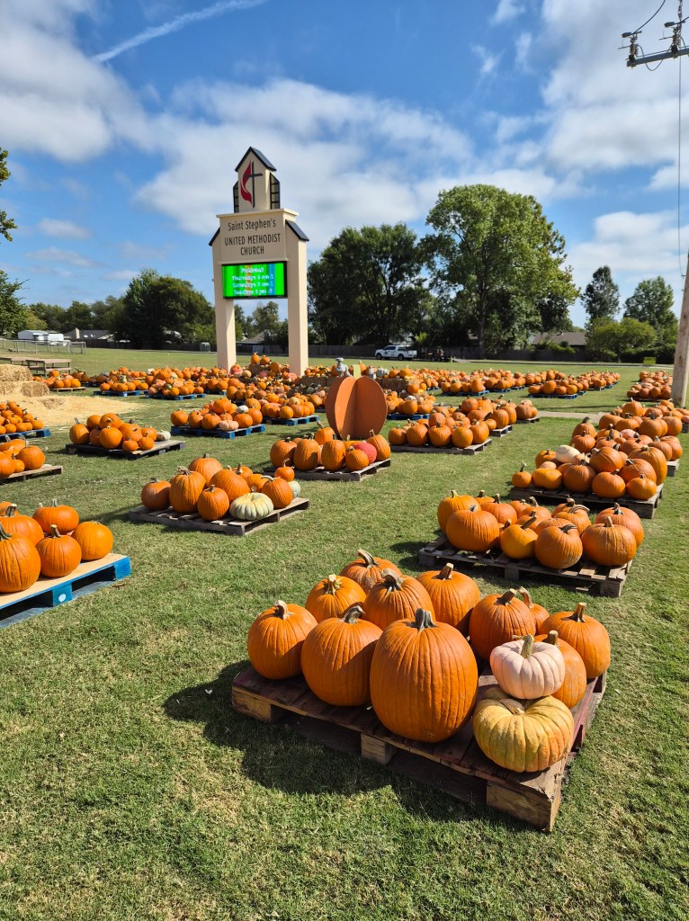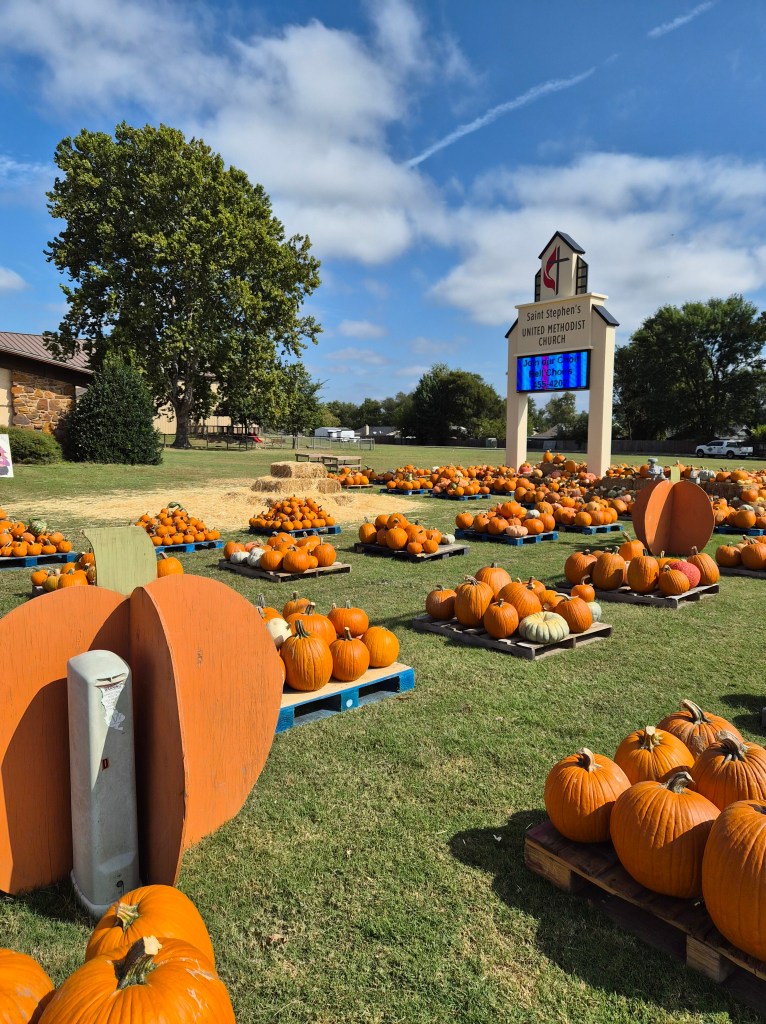 St. Stephen’s United Methodist Church in Broken Arrow has a pumpkin patch every year. On the first Sunday of October pumpkins are delivered by a semi and set up on the front lawn by many volunteers. We’re usually not here in October so we’ve never experienced the pumpkin patch. On Wednesday this past week we took Linda (Tom’s mom) to the pumpkin patch. They have a great setup, the prices are good and all the funds go to help local missions. I’m even told any left over pumpkins are picked up by a pig farmer to feed his pigs. If your in Tulsa/Broken Arrow or nearby I highly recommend stopping by to get a pumpkin, take a picture or just say hi. I picked up a couple of cute ones myself, said hi and took a picture.