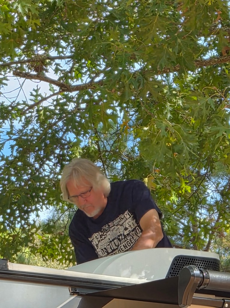 Tom got up on the roof of the trailer this afternoon and took off the cover of our bedroom air conditioner. We had some problems with it leaking in Tulsa but a repairman came out and fixed it. When we moved the trailer to Lake Eufaula it happened again. He’s talking with the manufacturer trying to get a fix. Thankfully we don’t need it right now so we have some time to get it taken care of. We’re going to have a 20 degrees temperature difference for a high tomorrow. We’re only expecting 60 degrees here. Tom said that will be good, I said I’m not so sure that will be good. It will be cooler for sure.