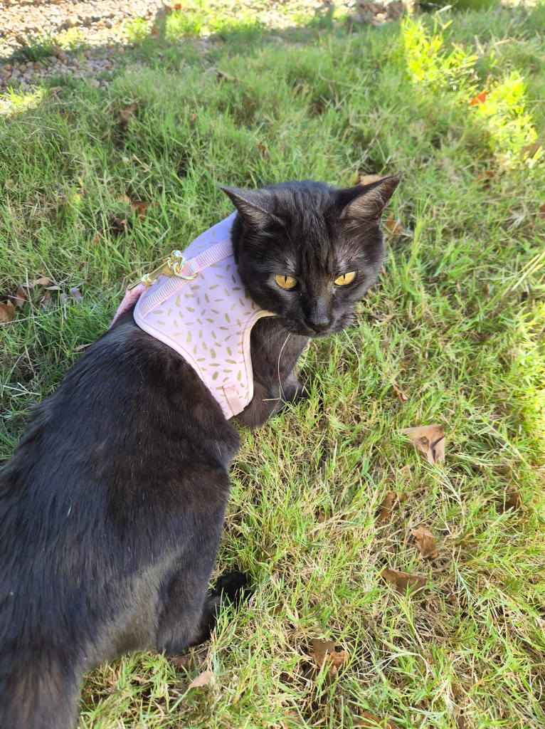 Thanks for reading along and seeing what we’re up to. It’s never a dull moment around here. Our latest activity is taking our cat Samantha for a walk. She loves the outdoors as she was a stray that we took in. We don’t let our cats out for fear of them getting hit by a car or getting lost. We used to have a catio but that’s not possible now. She loves going out and I wanted her to be able to go outside. We picked up a cat harness at the pet store. She loved it! So, enjoy this last picture of Samantha out for her daily walk.