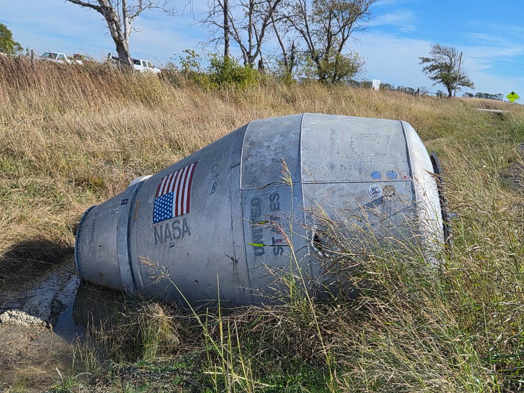 Since the incident, the mixer has been painted many times by artists and local citizens as it sits on the side of this remote road. It was a variation on the American flag for a long time until a few artists decided it needed a make over in 2011. They did much more than just paint this roadside attraction that has become important to the town. It was turned into a space capsule complete with the NASA logo, rocket thrusters and shiny aluminum paint. It is a convincing spectacle that is definitely worth stopping for.” (https://www.travelok.com/listings/view.profile/id.22870) We were only 40 minutes away so I wanted to go take a look. It was sort of anti-climatic. It’s just sitting off the side of the road. There was a lot of mud so I couldn’t get too close.