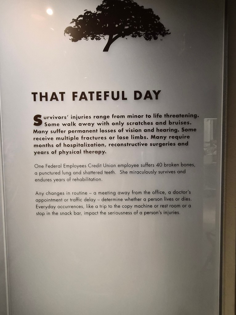 You are able to go into a room and hear the meeting of the water board, minutes before the bomb exploded at 9:02 a.m. on April 19, 1995. It was recorded and the bomb can be clearly heard and I imagine was felt as well.