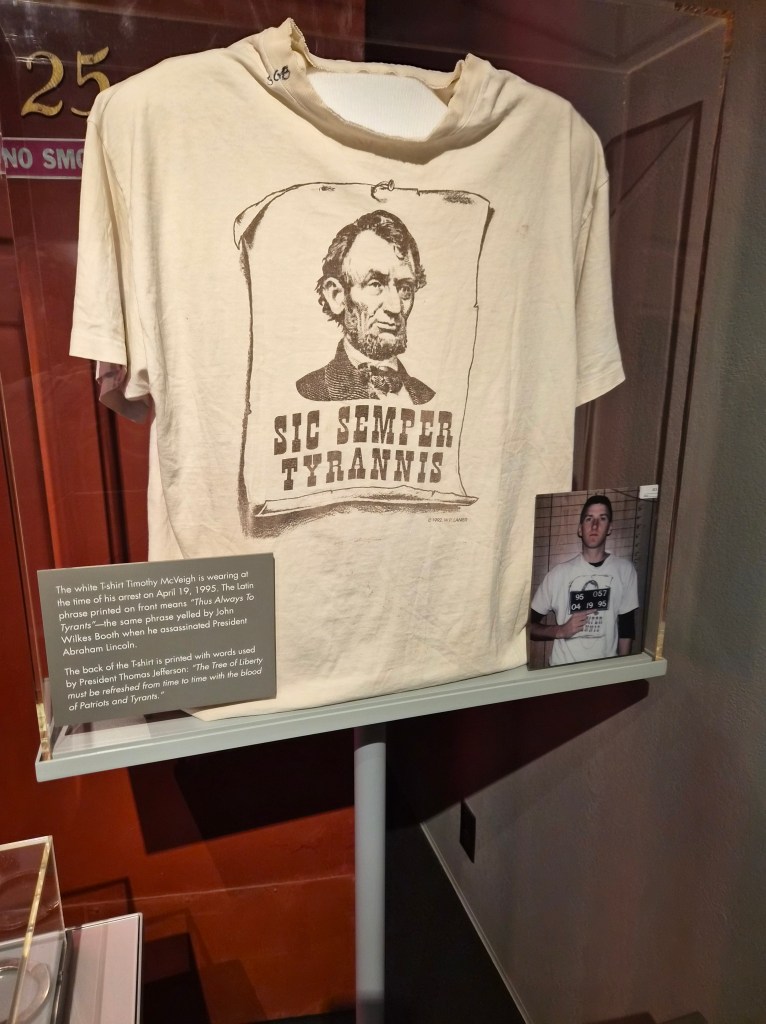 There is the sign from the hotel where Timothy McVeigh stayed, the shirt that he was wearing when he was caught, even the car McVeigh was driving when caught.