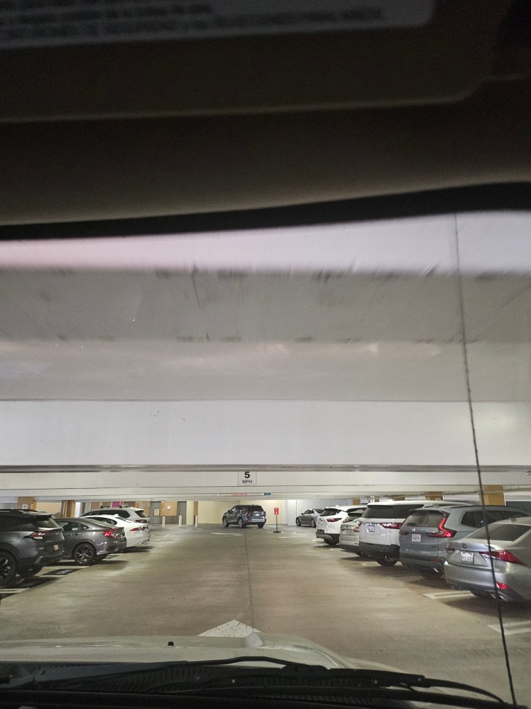 Yesterday we made the decision to remain in Los Angeles because the temperature at Joshua Tree was going to be around 107/108 degrees. Joshua Tree would have been hard to see, just from the truck. Speaking of the truck, I have a love/hate relationship with that thing. It certainly hauls us down the road but to park it is like putting a square peg in a round hole. We have more “discussions” (they really aren’t discussions, more like me telling Tom how he should park) about parking than anything else. Case in point, yesterday we went to the Sherman Oaks Galleria to see the new Jurassic Park (I liked it) and had to park in the parking garage. We had less than inches between the top of the truck and the beams of the parking garage. Here is a picture of my view. Look at the white concrete beam (a little blurry).