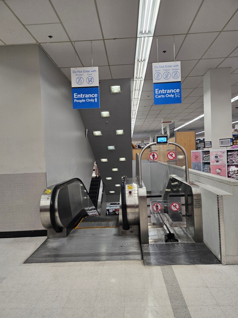After my many walks to the laundry this morning, Tom felt sorry for me and came to carry the load back, we went to Wal-Mart. There are Wal-Mart Neighborhood Markets, of which we originally went to, that did not have what I wanted and there was of course another “discussion” about parking. We found a Supercenter a mile away and it has two floors! Just like the Target earlier this week, this one has a place where you can put the cart to go down or up too. I’m going to have to get a cart next time I see one of these.