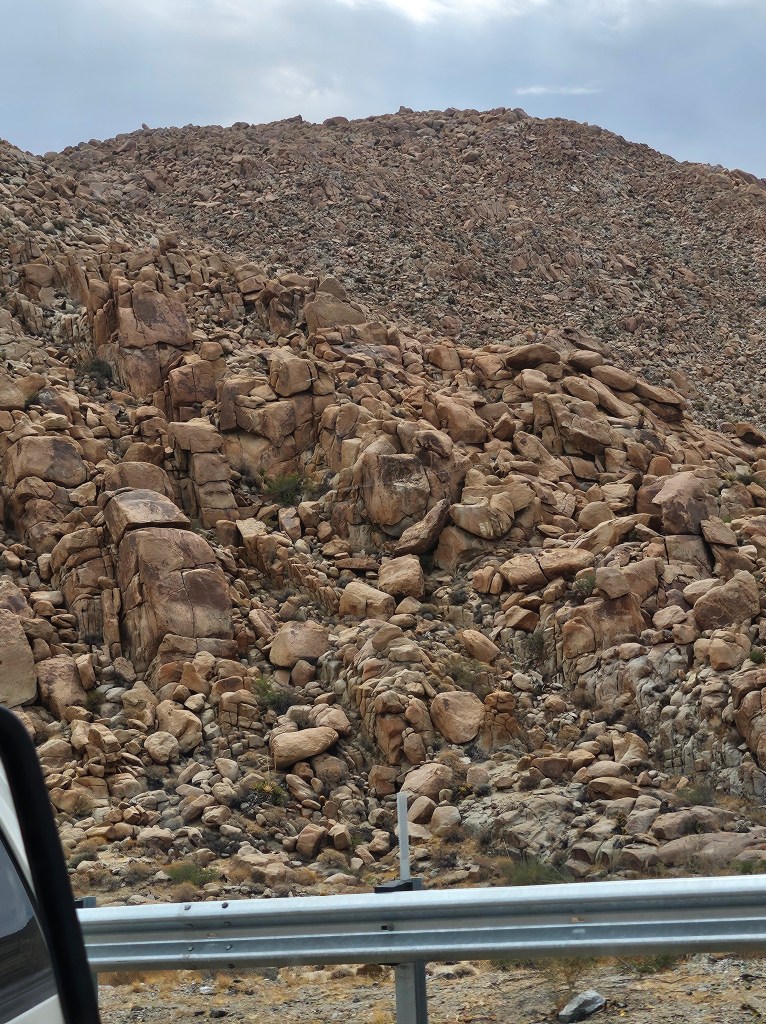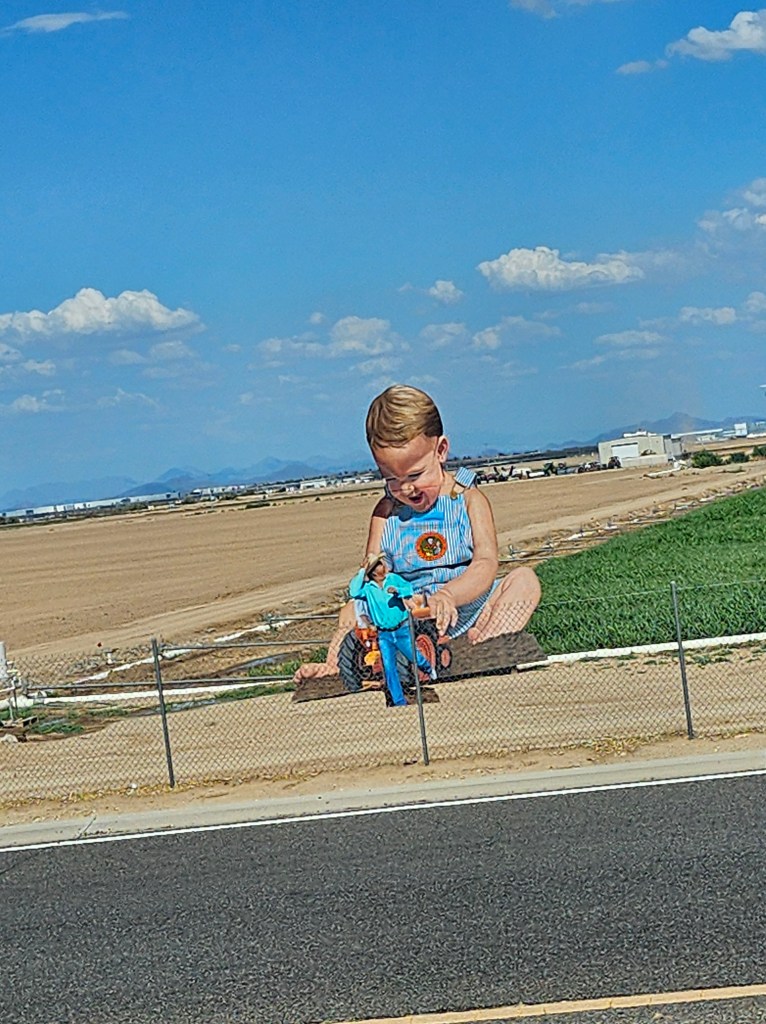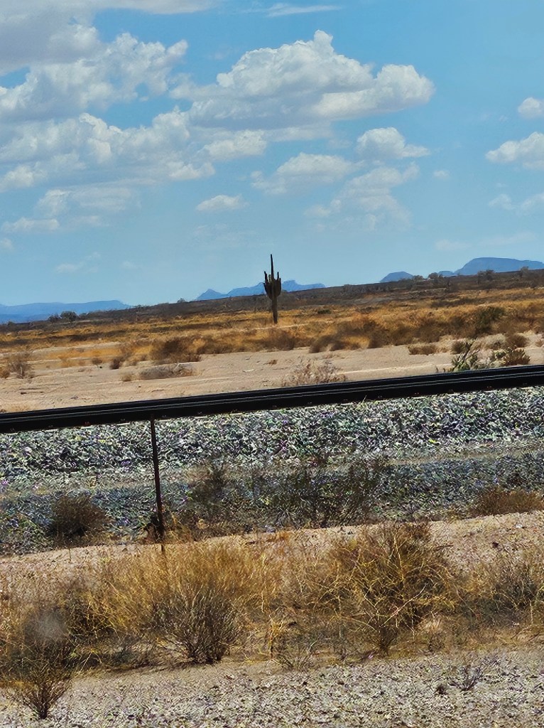 It started turning hot just a few miles out of San Diego and by 50 miles we were well into the 90’s. We saw a lot of flat open areas except for these rocks. I told Tom it looked like a quarry. Here’s also a picture of a lone cactus. And we saw this very large baby right before getting into Phoenix. A friend said it was a family farm.