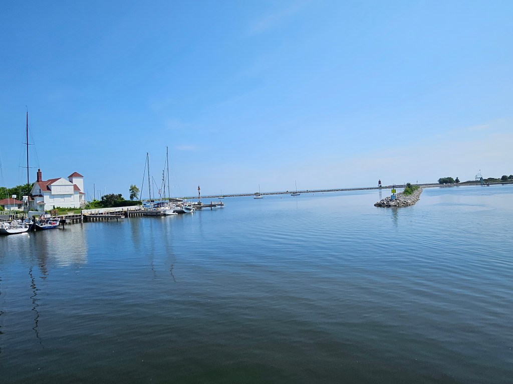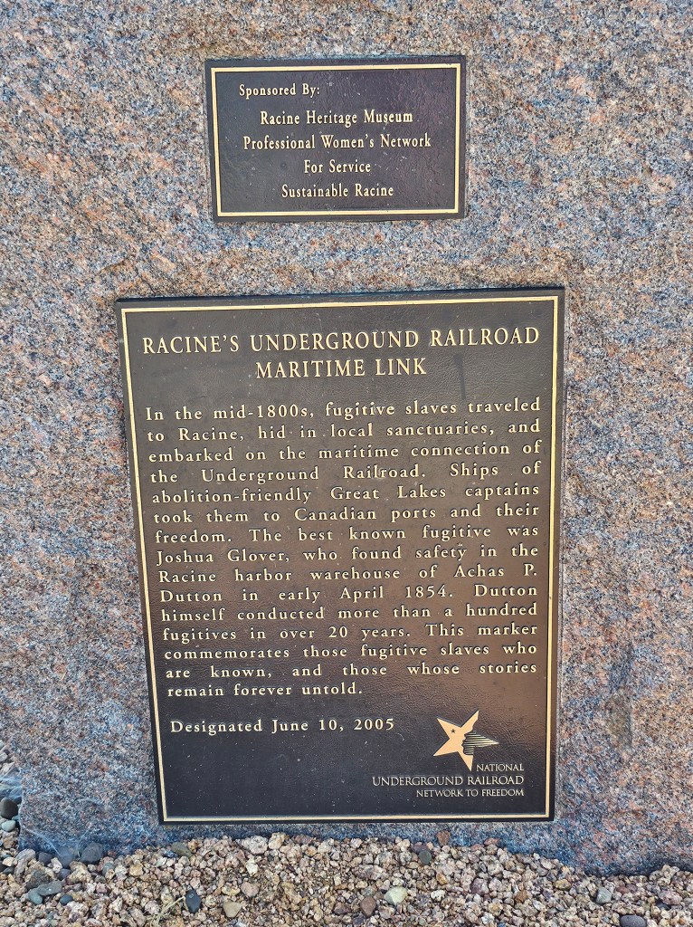 This morning we headed out to see Lake Michigan. Tom had mapped a path that just so happened to coincide with Racine. You might remember the name if you have ever watched “A League of Their Own.” They were the team battling the Rockford Peaches in that movie. We passed through Rockford, IL but were unable to stop. I didn’t mention us visiting the Peaches and Tom said I was about 80 years too late. We weren’t able to get close to the Lake, well close enough I guess. But we did see some interesting things. Chief among them was a Historical Marker about the Underground Railroad.