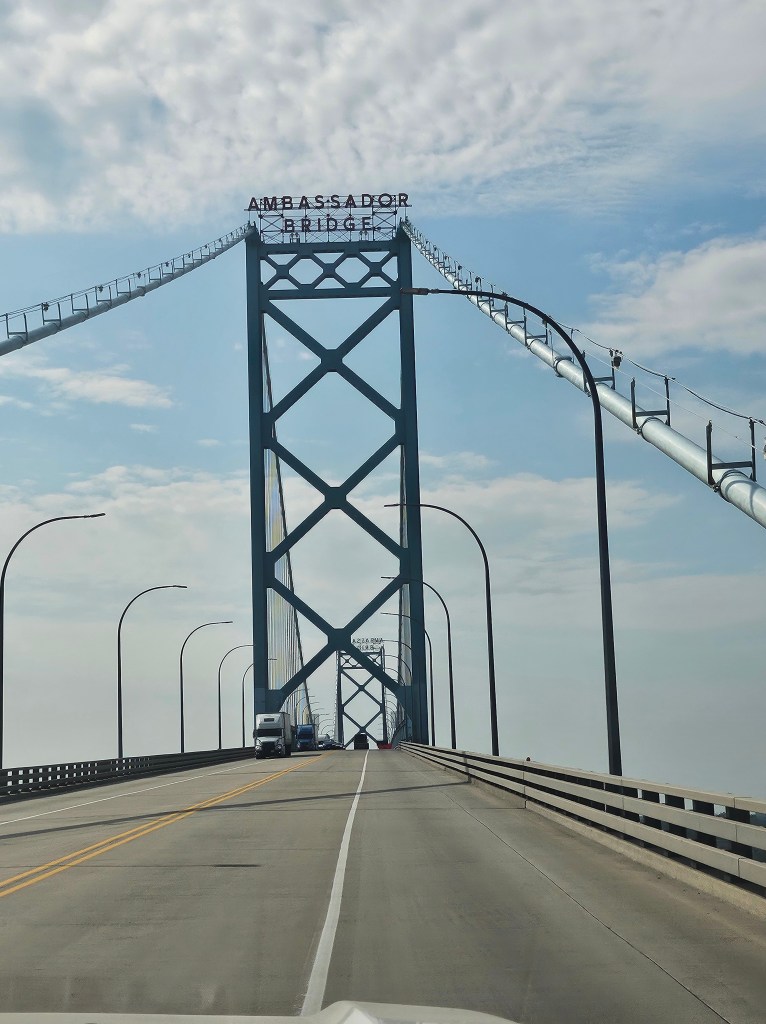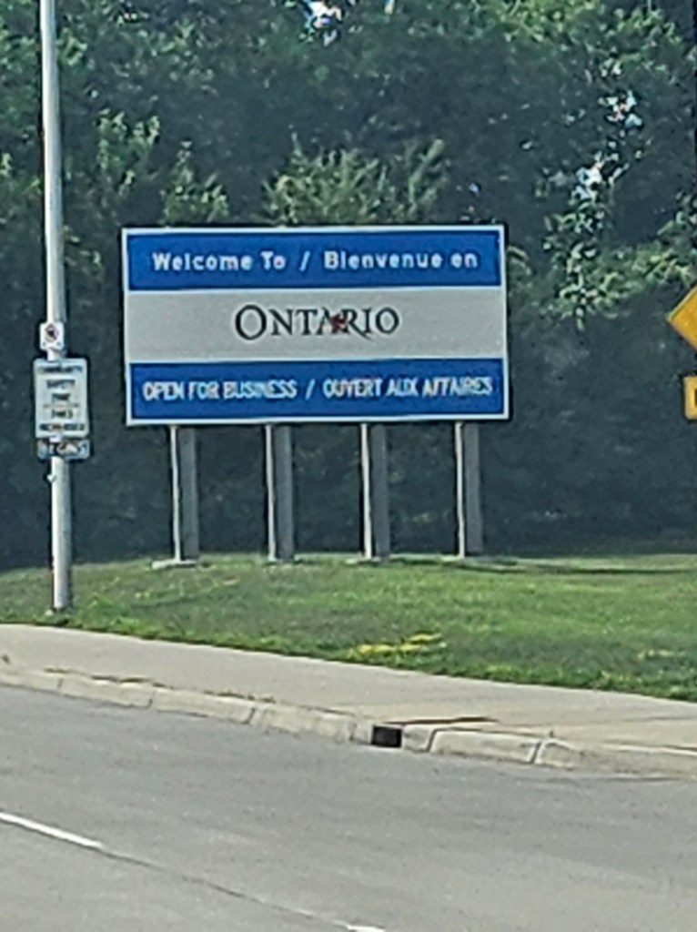 We briefly waited for our turn and then went through a 10 minute discussion with border control. He was very nice but asked many questions, which we promptly answered. He took down our license plate and our passports. Sadly, no stamp in my passport. He did come and check the backseat of the truck. I guess in case we were trying to bring anyone in. We were not. We have enough trouble with cats. I don’t think I could deal with anyone else right now. We did see a sign for London, but sadly not London England.
