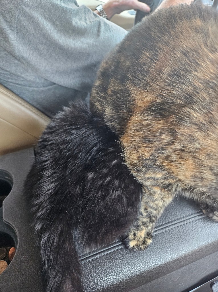 We’ve spent the day making changes to our itinerary but that’s a post for another day. I’m glad to be here for more than a day or two and I know the cats are as well. Penny has now chosen the console as her spot in the truck and when someone gets on it, she is none too happy. So, she just sits on them, as you can see from the picture above.