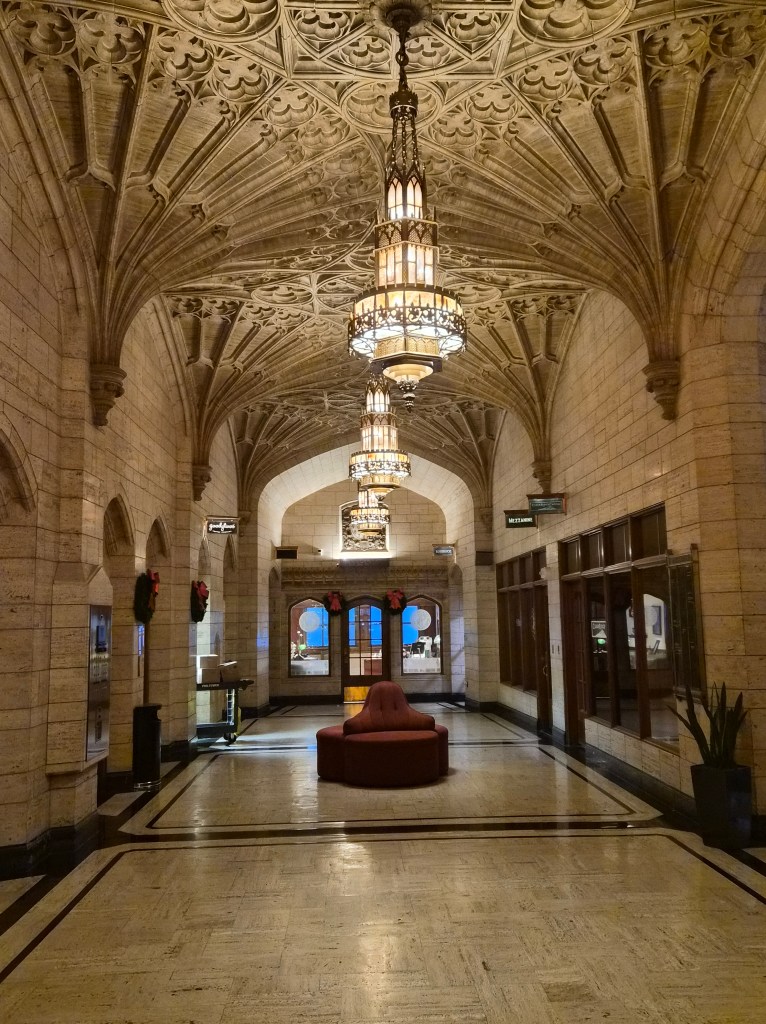 The buildings were art deco and I have heard that Tulsa has many art deco buildings. There is a tour to explore the art deco of the area as well. This space below allowed smoking for many, many years. When it was originally built the ceiling was white. They tried to clean it but it took so much work they abandoned that idea and left it as it was.