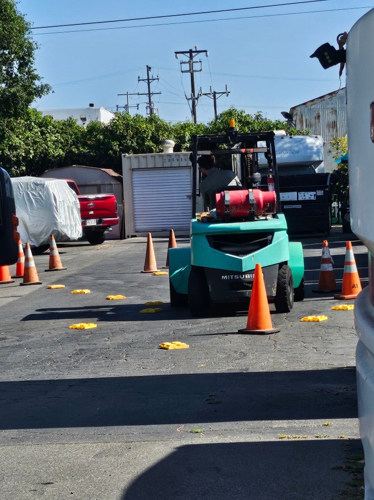 Yesterday we made the decision to remain in Los Angeles because the temperature at Joshua Tree was going to be around 107/108 degrees. Joshua Tree would have been hard to see, just from the truck. Speaking of the truck, I have a love/hate relationship with that thing. It certainly hauls us down the road but to park it is like putting a square peg in a round hole. We have more “discussions” (they really aren’t discussions, more like me telling Tom how he should park) about parking than anything else. Case in point, yesterday we went to the Sherman Oaks Galleria to see the new Jurassic Park (I liked it) and had to park in the parking garage. We had less than inches between the top of the truck and the beams of the parking garage. Here is a picture of my view. Look at the white concrete beam (a little blurry).